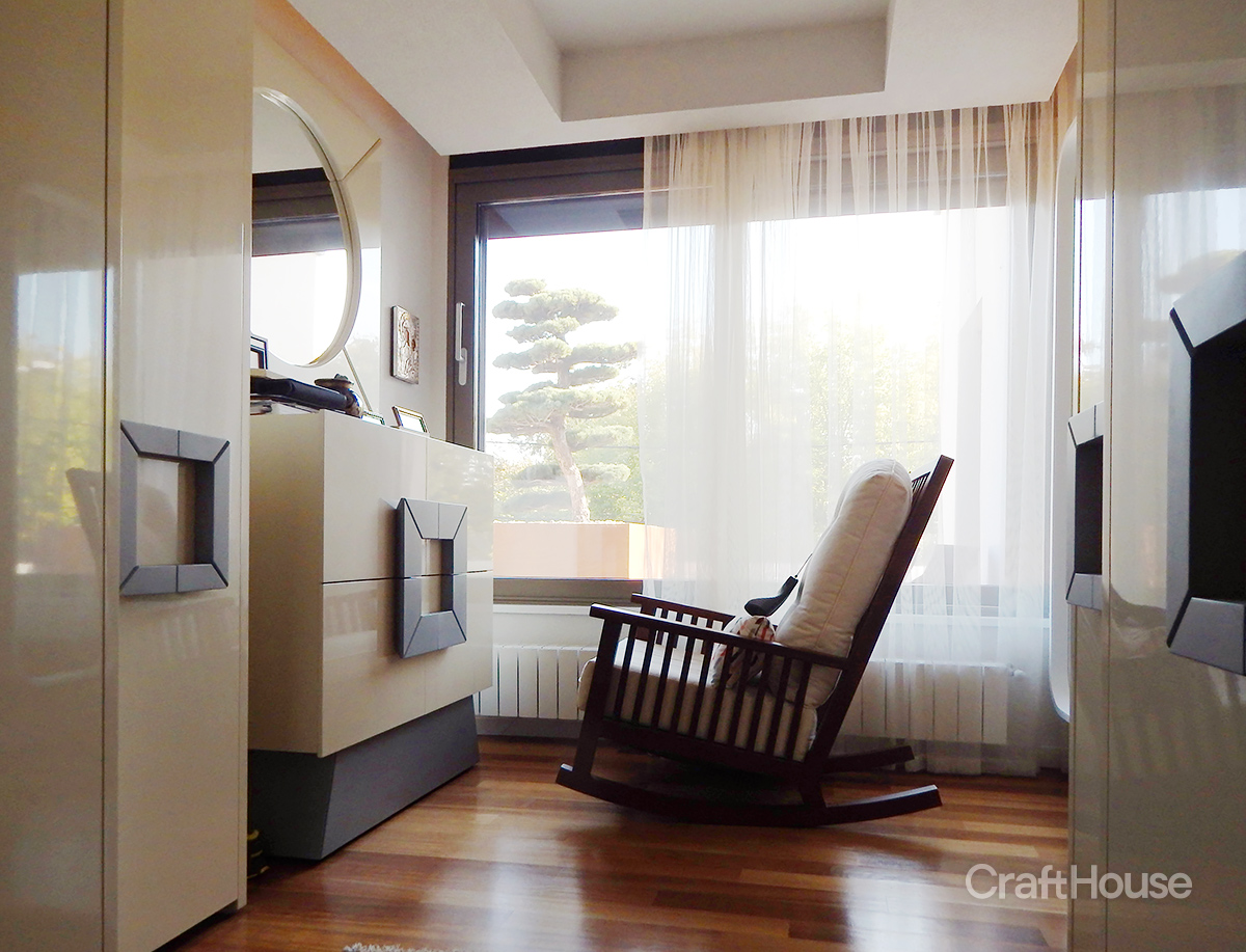 Dormitorul a dobandit un design modern, o terasa ampla, cu vegetatie si un dressing generos. Baia matrimoniala, care s-a dorit a fi "wow", a constituit un proiect complex în sine; piesa centrala este "cutia" de onix iluminat a dusului.