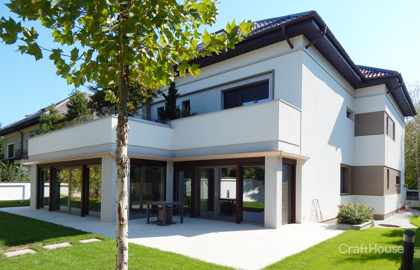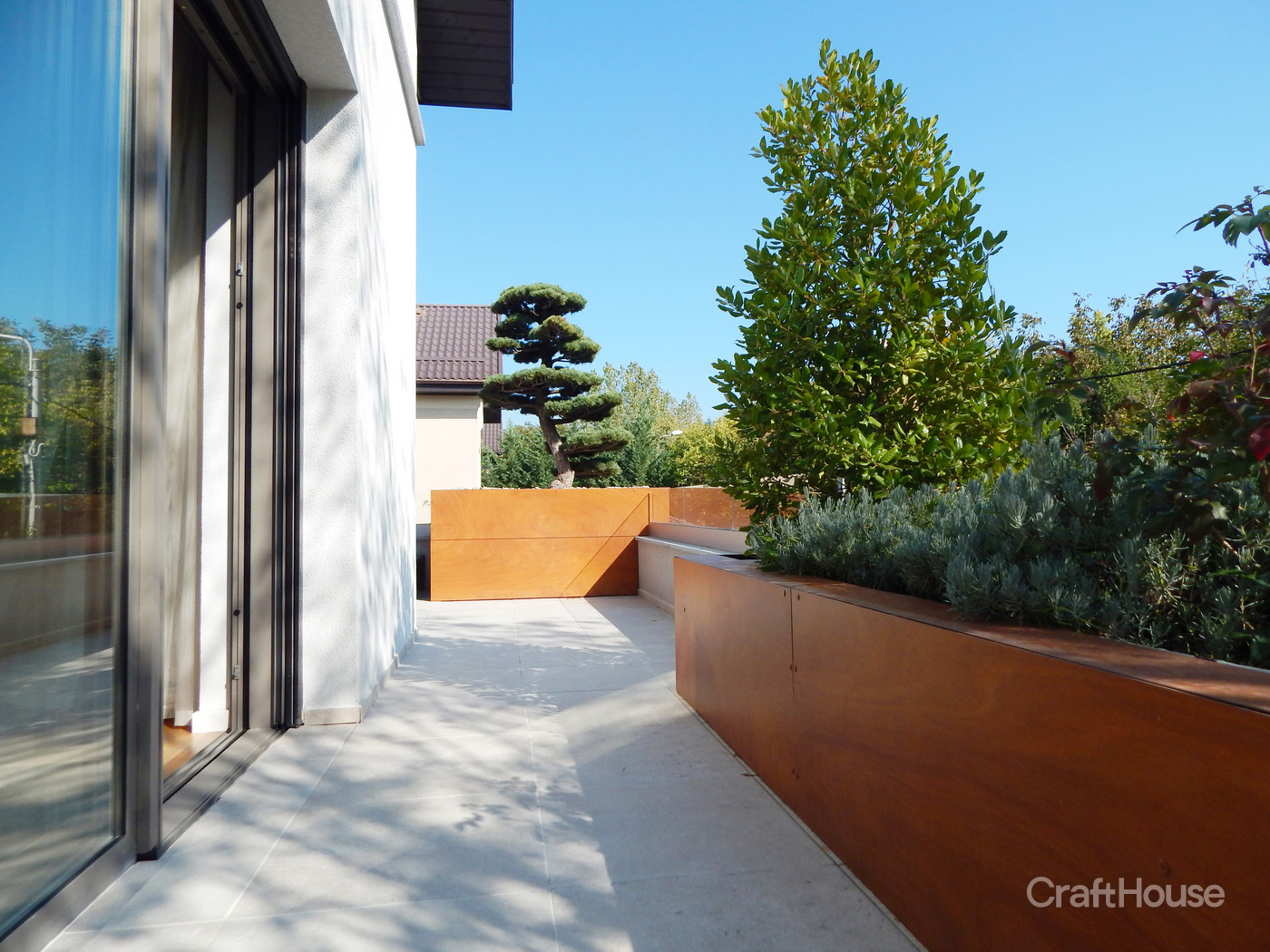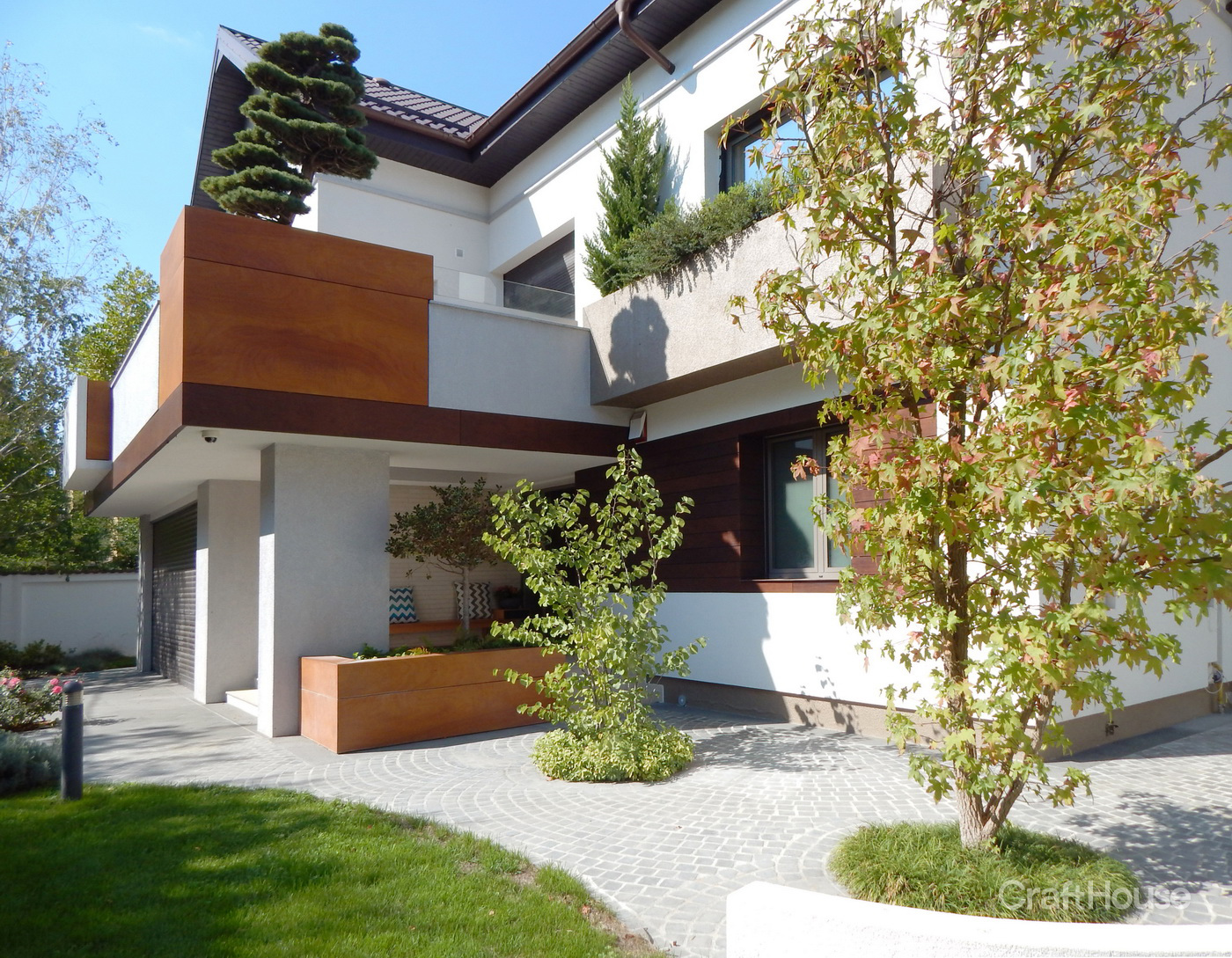Exteriorul, cartea de vizita a unei case, nu putea fi neglijat, intervenindu-se estetic si functional asupra cladirii si curtii: redesenarea fatadelor; aplicarea de materiale de cea mai buna calitate, durabile, pentru pastrarea aspectului impecabil o perioada indelungata; schimbarea tamplariei exterioare; un nou concept de imprejmuire si de amenajare a spatiului curtii; introducerea de zone verzi pe terasele rezultate in urma interventiei.
