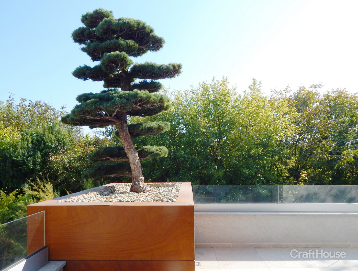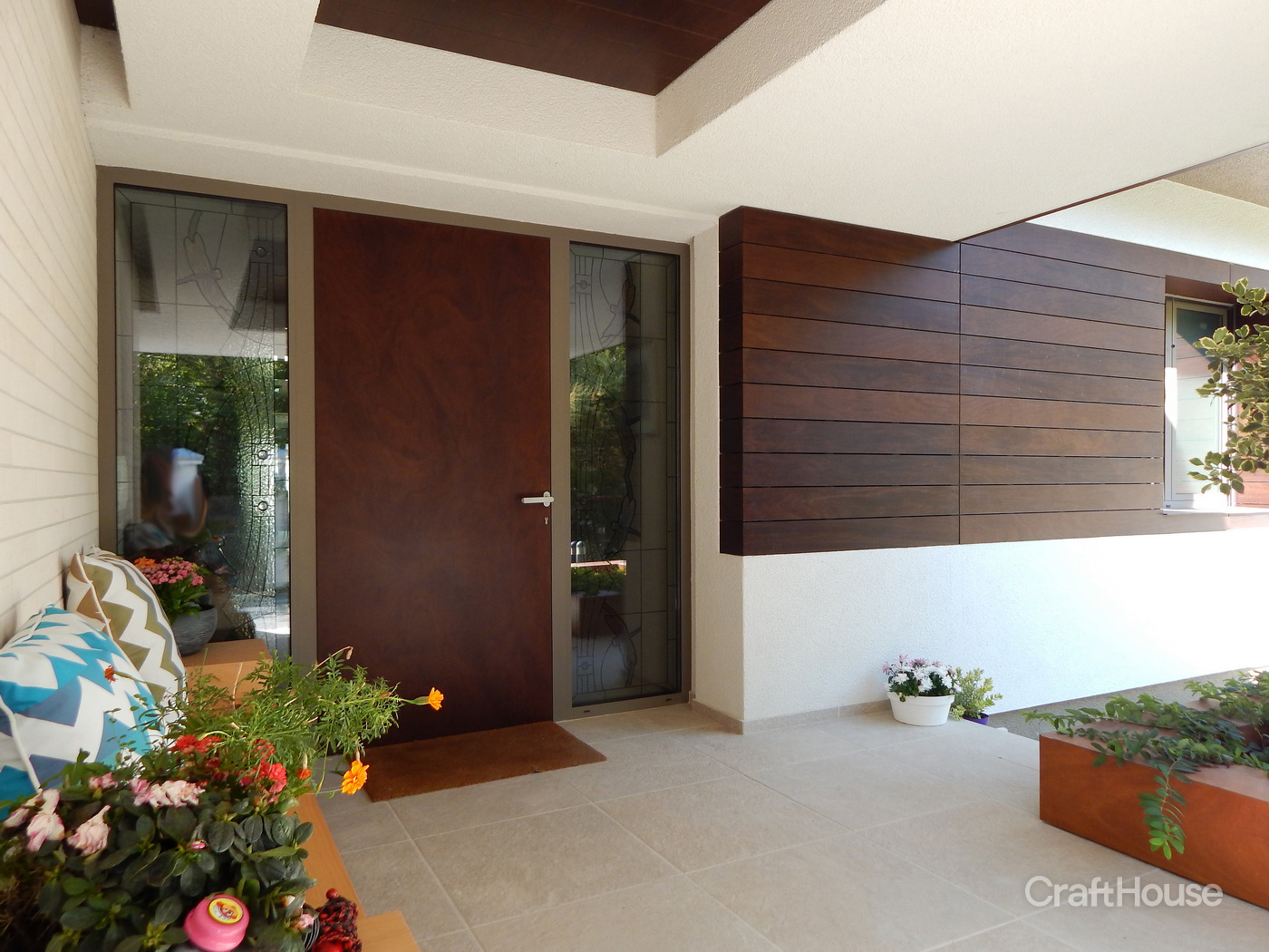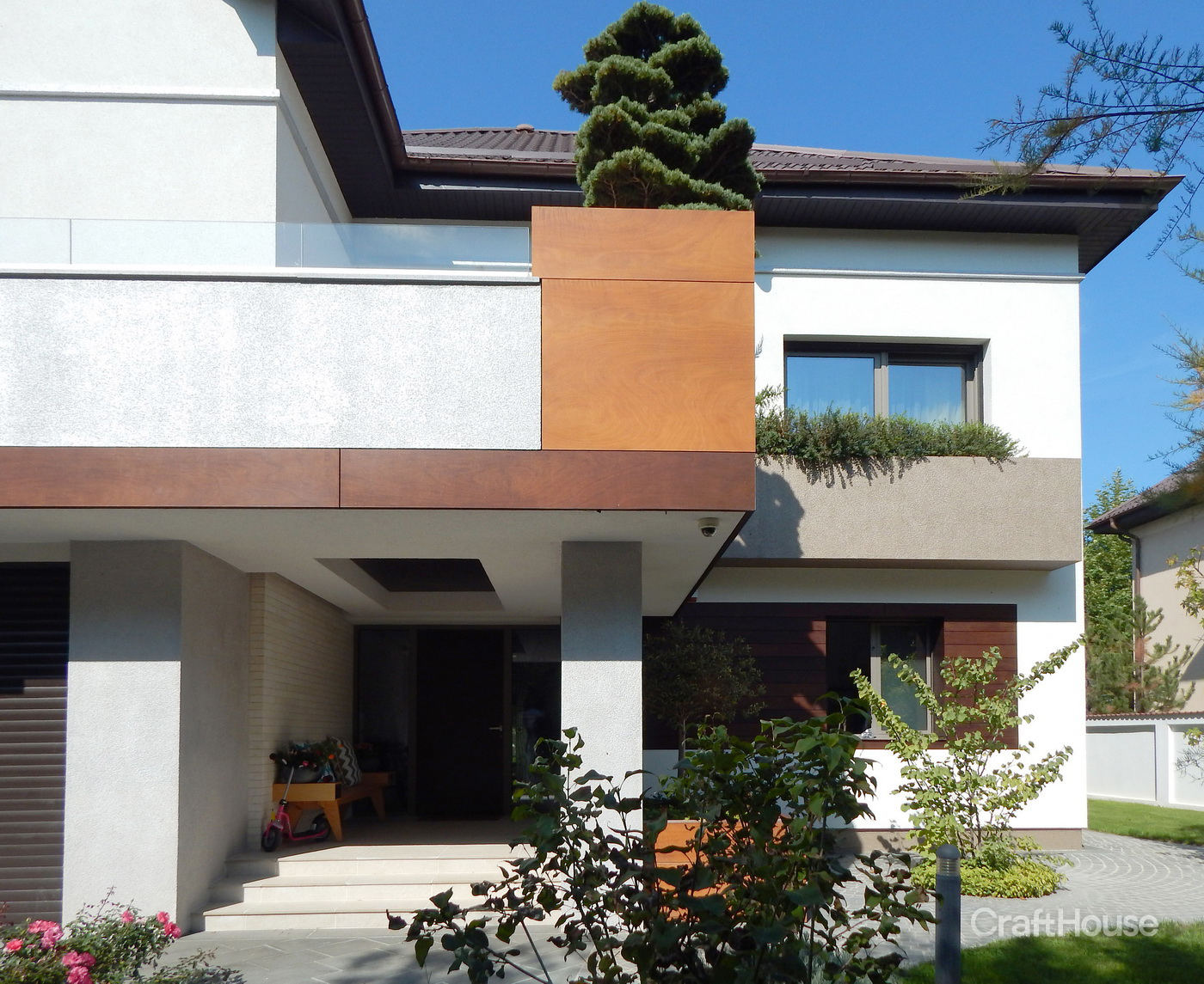 Exteriorul, cartea de vizita a unei case, nu putea fi neglijat, intervenindu-se estetic si functional asupra cladirii si curtii: redesenarea fatadelor; aplicarea de materiale de cea mai buna calitate, durabile, pentru pastrarea aspectului impecabil o perioada indelungata; schimbarea tamplariei exterioare; un nou concept de imprejmuire si de amenajare a spatiului curtii; introducerea de zone verzi pe terasele rezultate in urma interventiei.