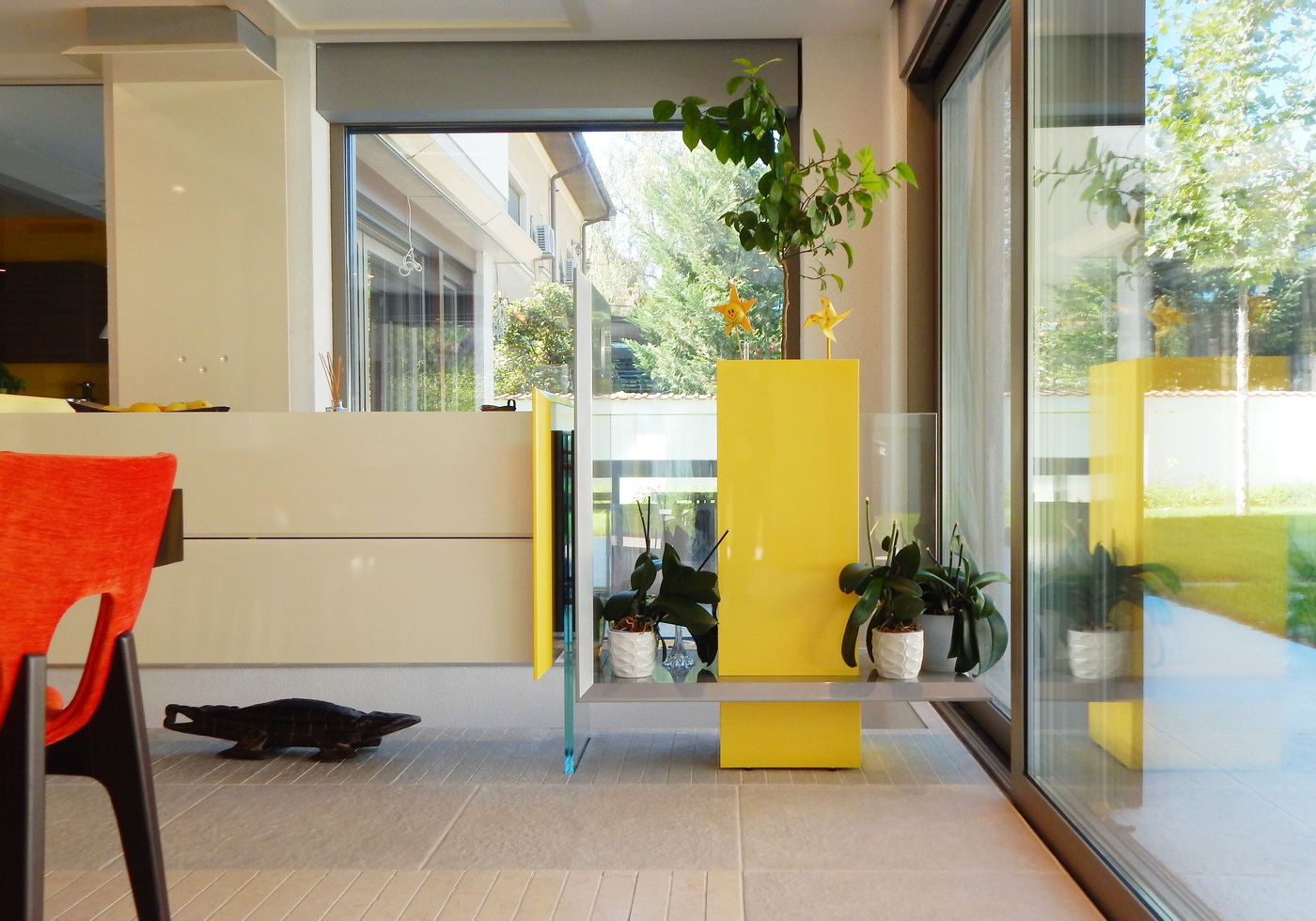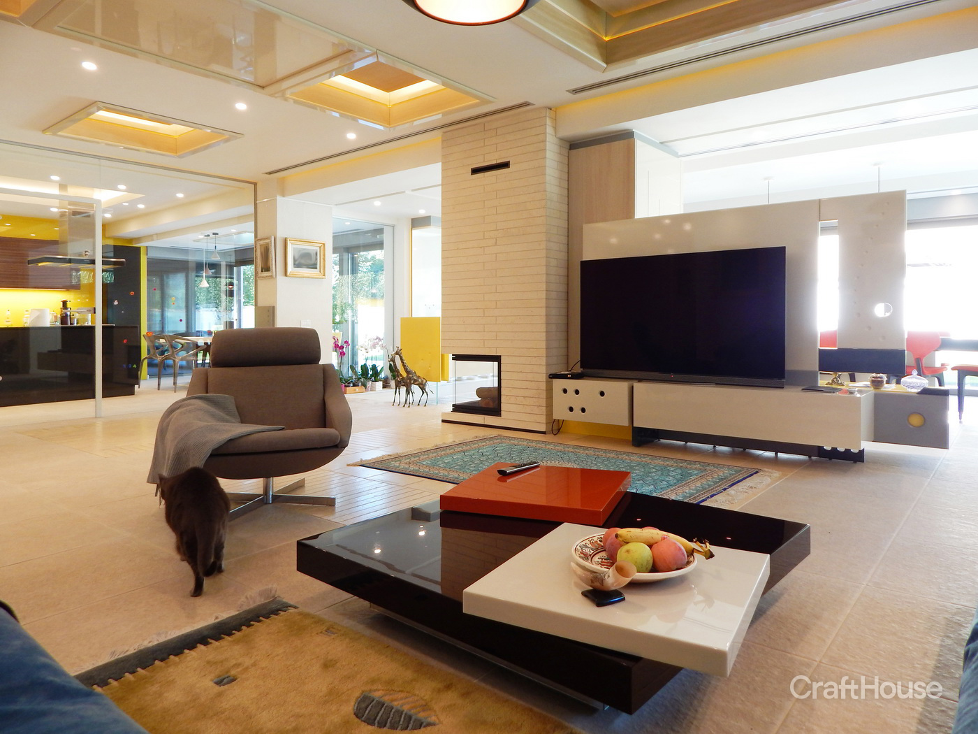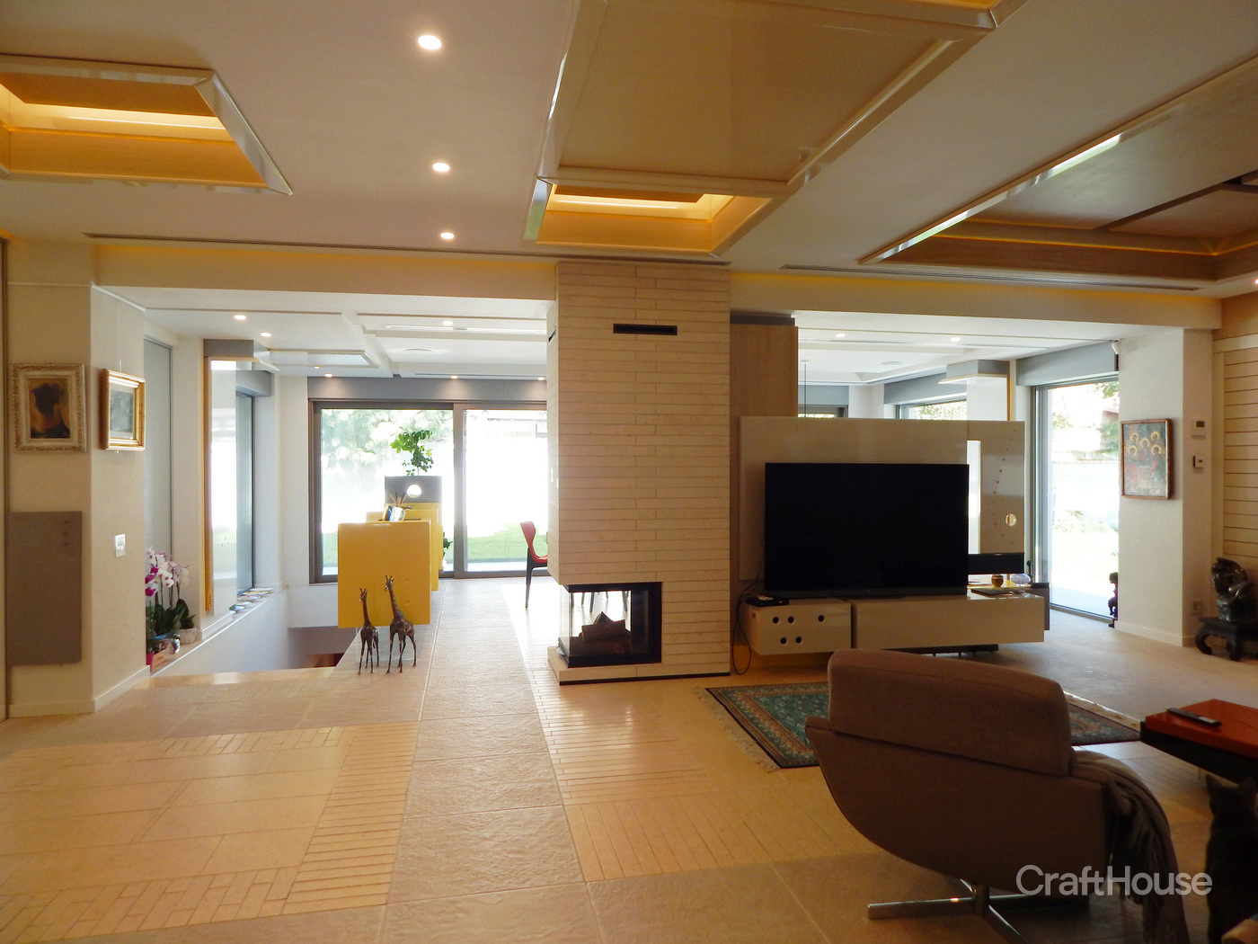 Zona de zi (livingul, diningul si bucataria) se remarca printr-o relatie interior-exterior spectaculoasa, cu deschideri vitrate ample care, in lunile calduroase, devin adevarate terase acoperite.