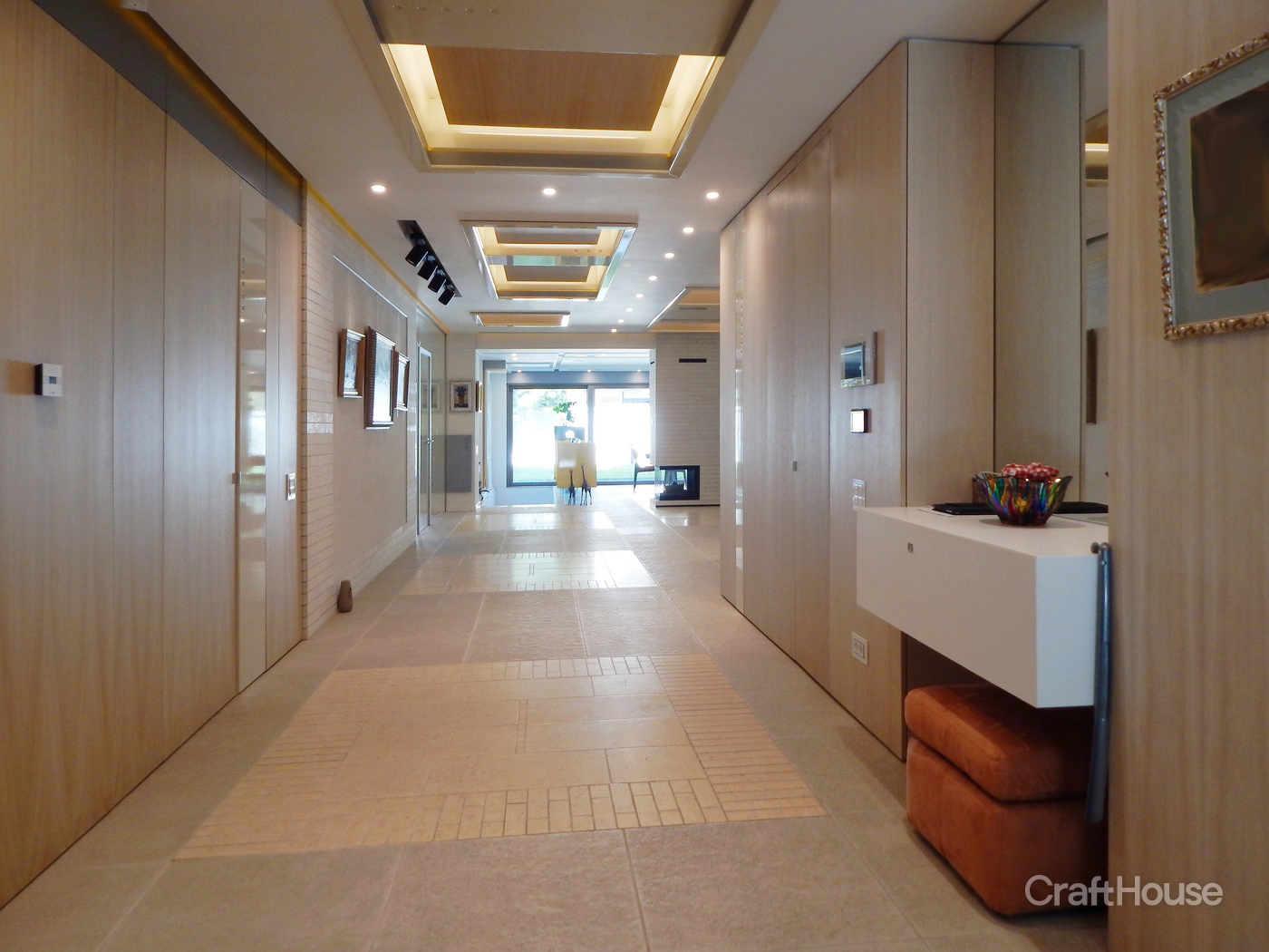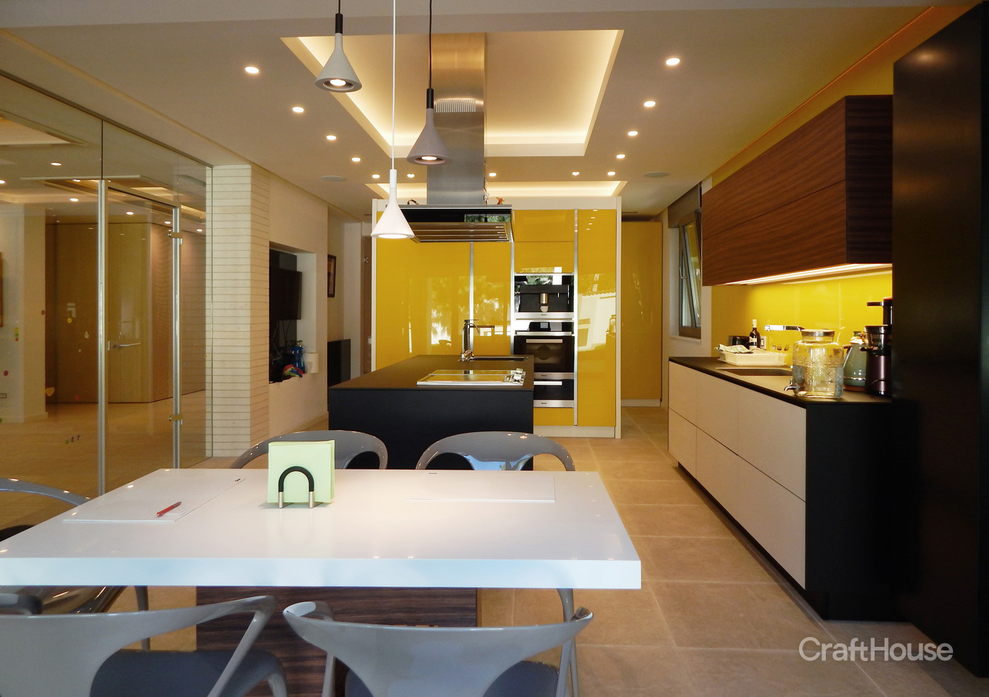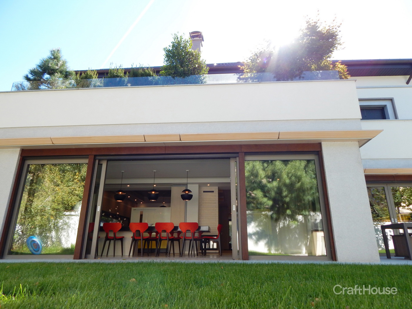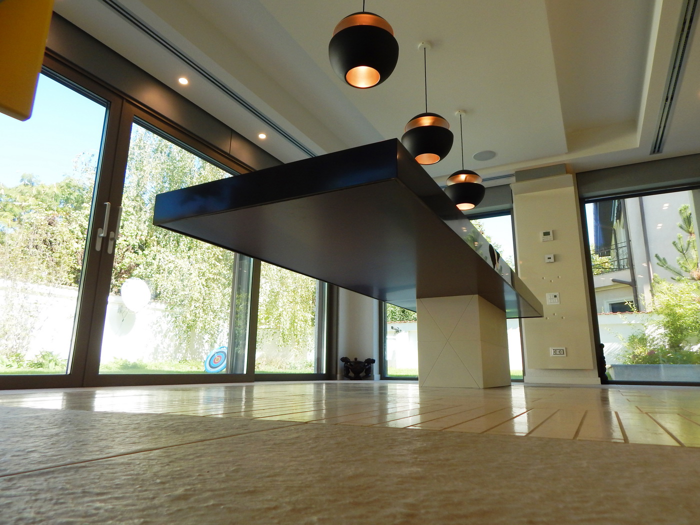 Zona de zi (livingul, diningul si bucataria) se remarca printr-o relatie interior-exterior spectaculoasa, cu deschideri vitrate ample care, in lunile calduroase, devin adevarate terase acoperite.